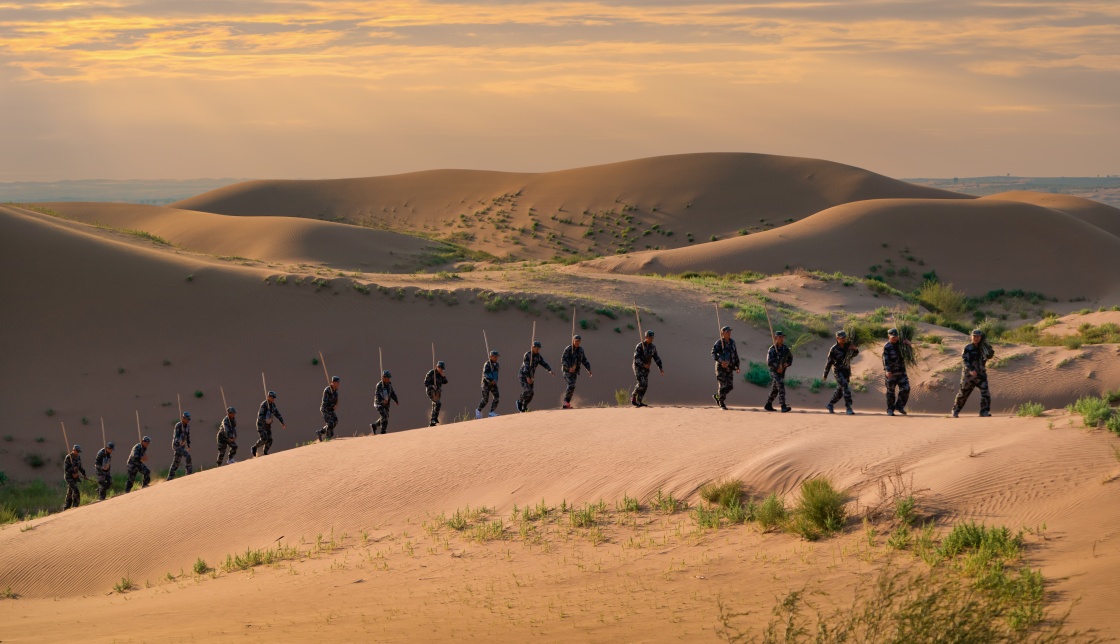 內蒙古鄂爾多斯市杭錦旗人武部組織干部職工和民兵深入庫布其沙漠開展治沙綠化(2019年9月4日攝)。新華社發(楊建榮 攝)