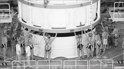 比如貯箱、箱間段的“合體”工作。我國現(xiàn)役運載火箭芯級的最大直徑是3.35米,貯箱長10米左右,它們的貯箱、箱間段“合體”時,需要有人用肉眼辨別貯箱和箱間段的對接處是否吻合,再由多名總裝工人手動調(diào)整貯箱和箱間段的位置和姿態(tài)。但大火箭的貯箱直徑5米、長20米、重5噸,“眼看、嘴喊、手工推”的老辦法“不管用”了。航天科技集團中國運載火箭技術(shù)研究院數(shù)字化總裝對接技術(shù)負(fù)責(zé)人李新友告訴記者,在科研人員的努力下,經(jīng)過幾年攻關(guān),今年春天,長征五號芯一級貯箱、箱間段實現(xiàn)了數(shù)字化總裝對接,我國成為世界上為數(shù)不多掌握這一技術(shù)的國家。