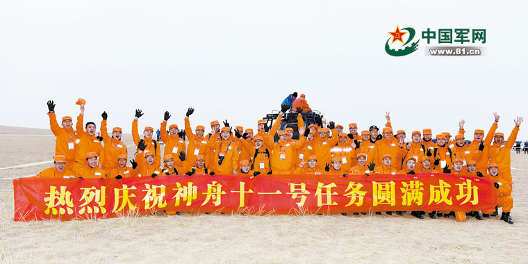 13時59分,神舟十一號飛船返回艙成功著陸,航天員景海鵬、陳冬從太空回到地球家園。