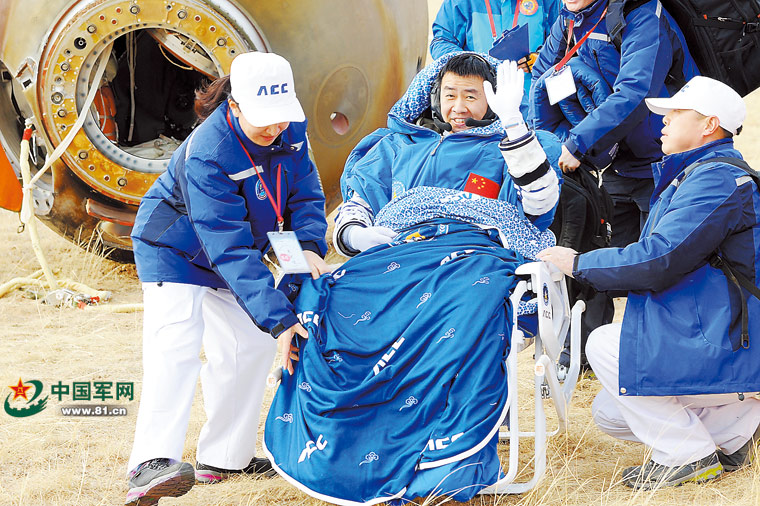 艙門打開后,航天員救生系統技術組組長吳元亮最先進入艙內。他對兩位航天員進行了初步生理狀況檢查,詢問他們的感覺和身體情況。吳元亮向指揮長報告:航天員健康狀況良好,可以出艙。