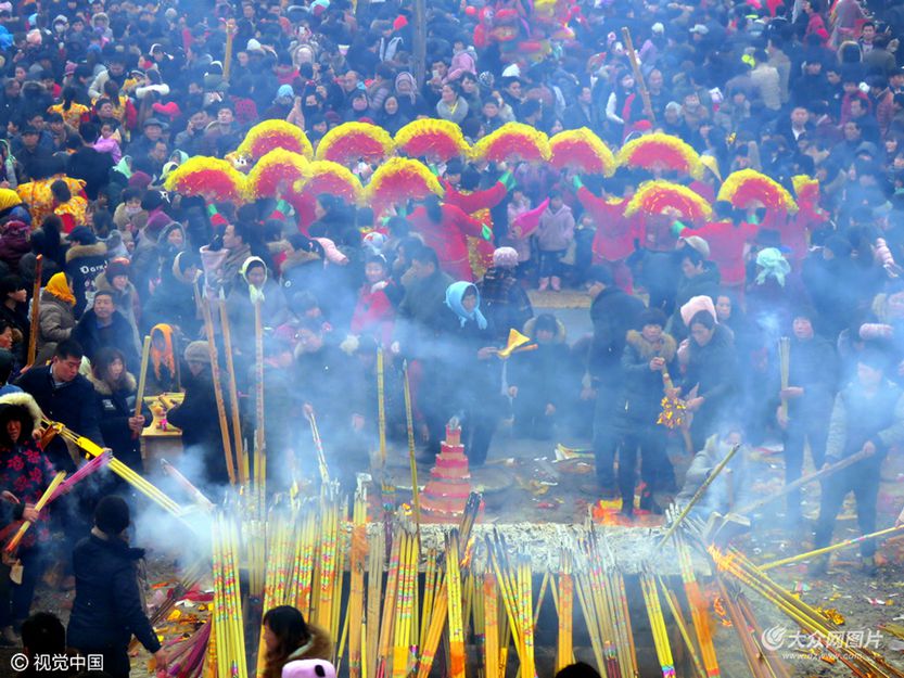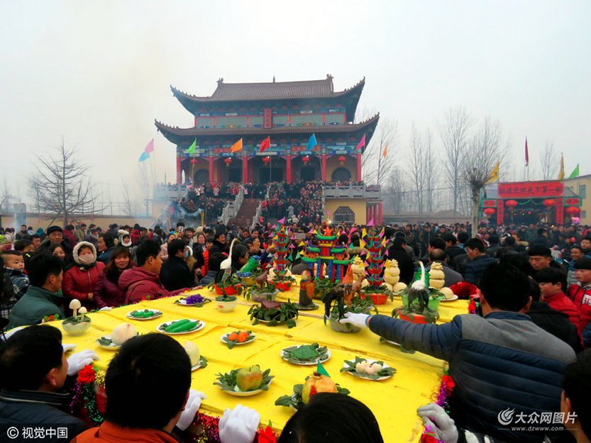 正月初七,是菏澤民俗“火神節”,也是菏澤曹縣桃源集鎮鄉民們舉行一年一度花供火神廟會的日子。雖前日夜降下小雪,但周邊群眾并沒減少對趕廟會、看花供的熱情,數萬村民、游客前往村東火神廟,祭奠火神、觀賞花供。