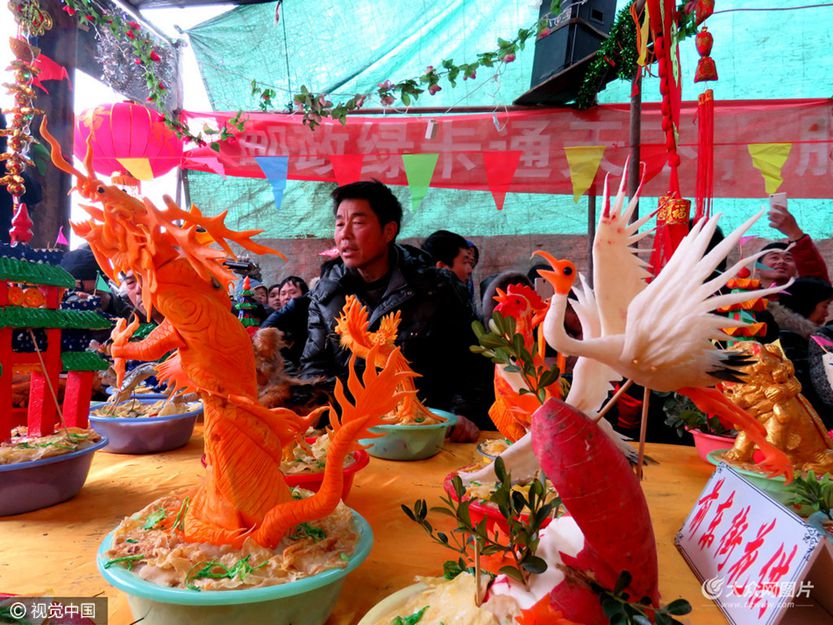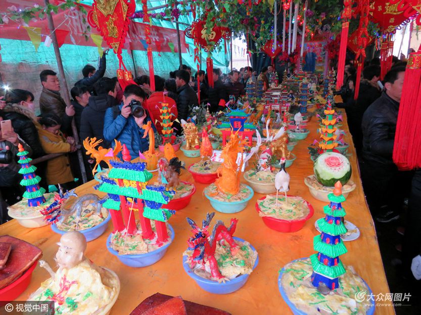 昔日,窮苦人家拿不出雞、魚、肉等禮品,只好用白面捏蒸成雞、鴨、魚、豬頭等仿生面塑代之,后來又發展成用白蘿卜刻成香瓜圣果、亭臺樓宇等藝術品。