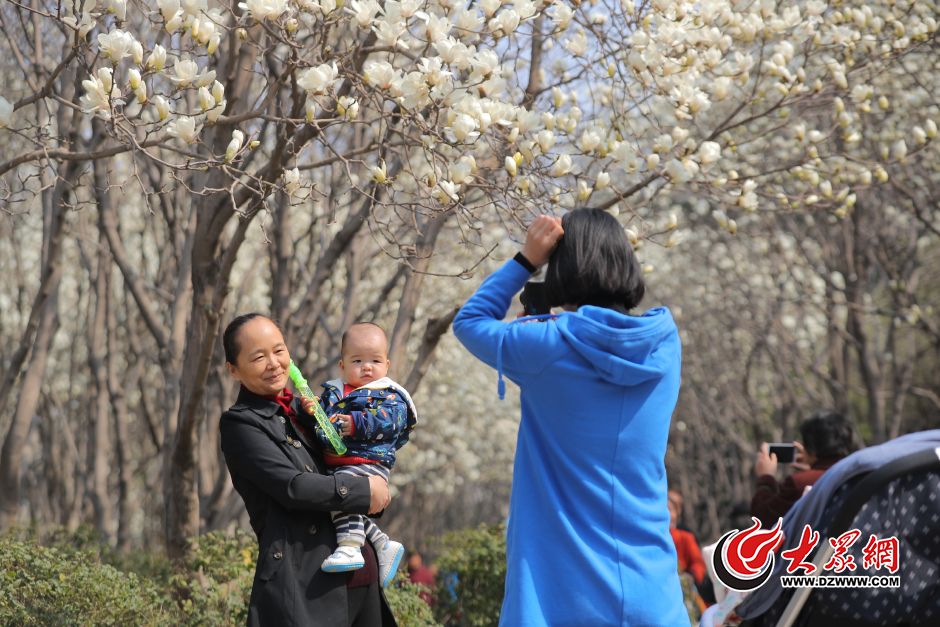 3月16日,白玉蘭正值盛花期,市民在濟南百花公園白玉蘭樹下拍照留影。百花公園內,六百株玉蘭迫不及待地傳遞春的訊息,花開爛漫、滿樹清香。漫步園中,無論遠觀還是近看,潔白的花朵,如云似雪,壓得枝頭搖搖欲墜。大眾網記者 王長坤 實習生 孫明悅 攝