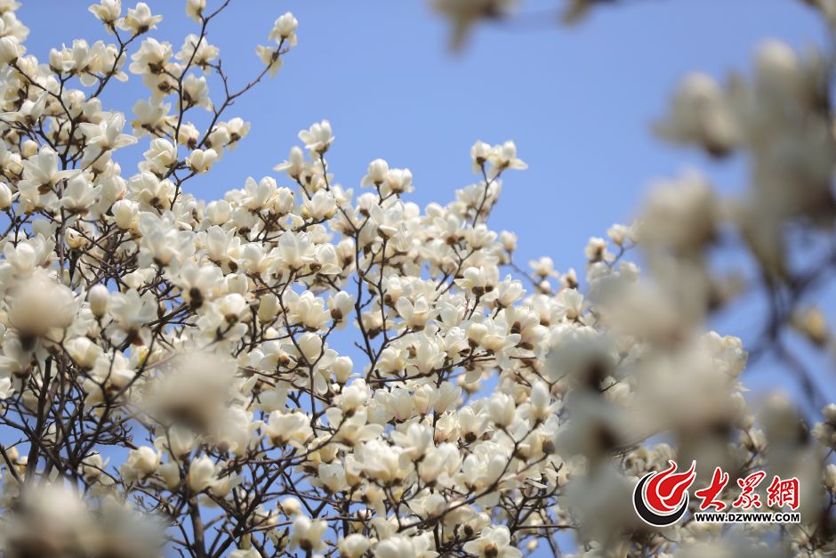 在藍天的映襯下,白玉蘭花朵在枝丫上亭亭綻放。大眾網記者 王長坤 實習生 孫明悅 攝