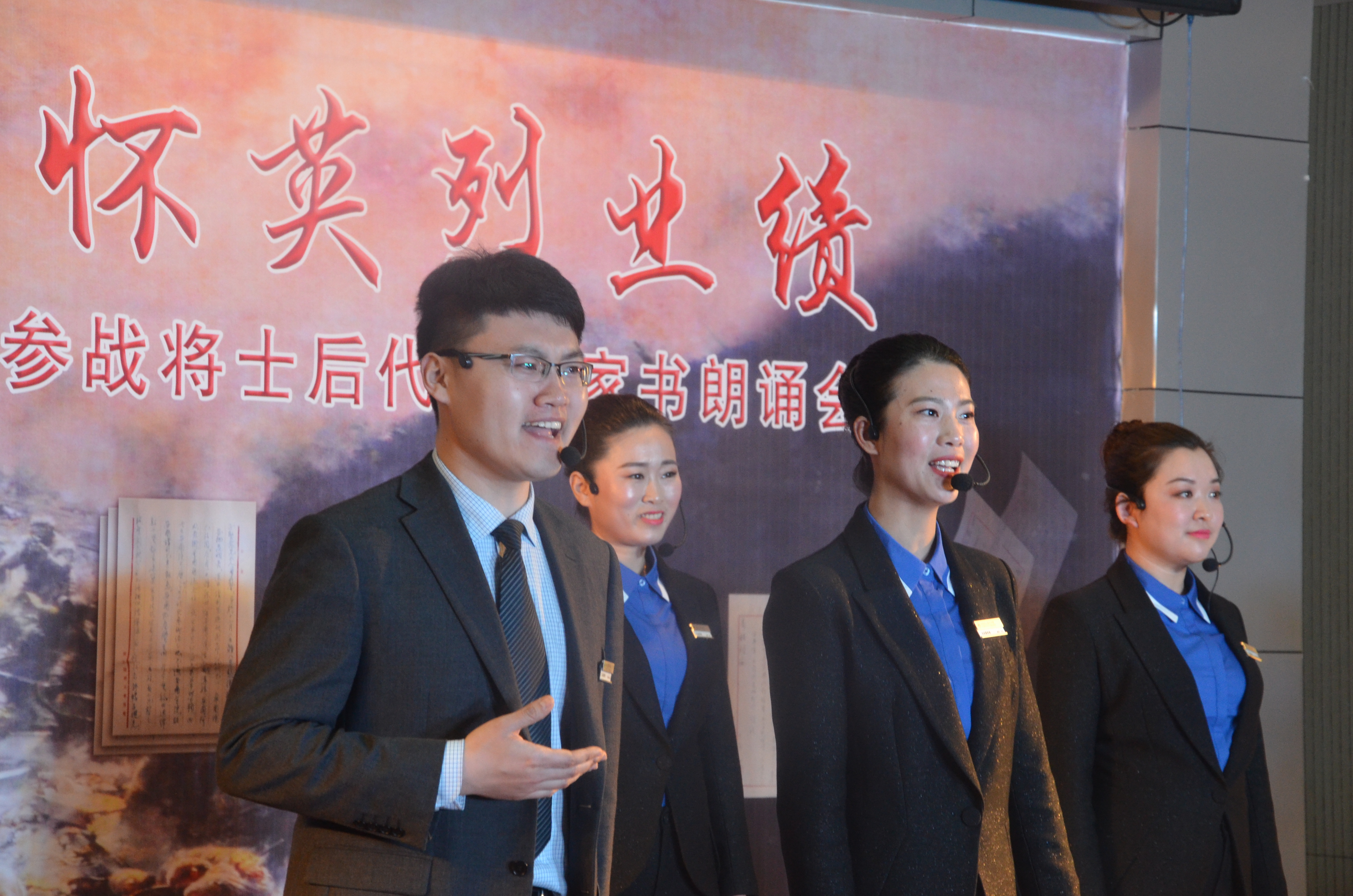 五十七人敢死隊隊長王范堂之孫王東升先生、第二集團軍少將高參陳紹法外孫女婿左中儀先生、李宗仁作戰參謀楊萍之子楊小川先生與紀念館講解員楊啟燕朗誦《空軍英雄何信致母親妻子的家書》