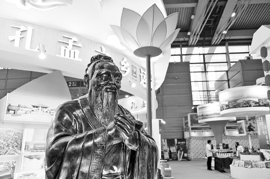 位于“一帶一路館”的文化濟寧展廳,入口處擺著一尊高2.3米的孔子雕像。馬輝 攝