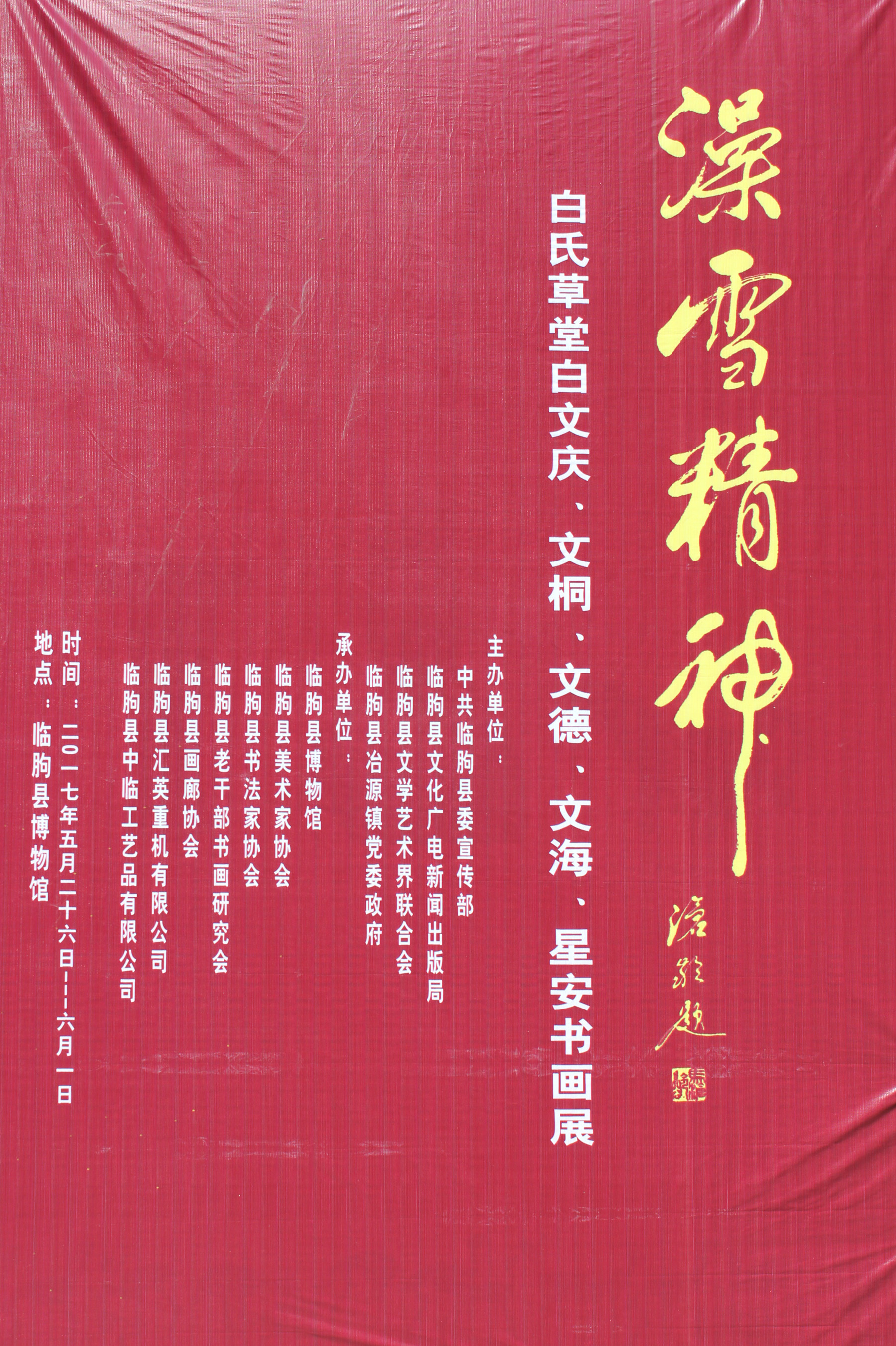 5月26日,由中共臨朐縣委宣傳部、臨朐縣文化廣電新聞出版局、臨朐縣文聯、臨朐縣冶源鎮黨委政府主辦,山東臨朐山旺古生物化石博物館、臨朐縣美術家協會、臨朐縣書法家協會、臨朐縣老干部書畫研究會、臨朐縣畫廊協會、匯英重機有限公司、中臨工藝品有限公司承辦的 “澡雪精神”—白文慶、白文桐、白文德、白文海、白星安五人書畫聯展,在山東臨朐山旺古生物化石博物館開展。