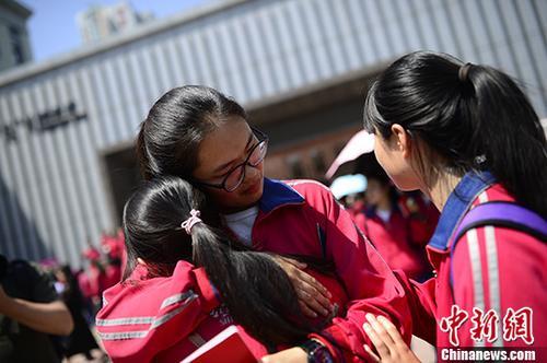 資料圖:內(nèi)蒙古高中生畢業(yè)典禮 同學(xué)擁抱惜別。中新社記者 劉文華 攝