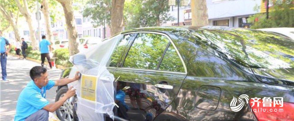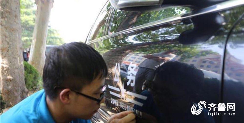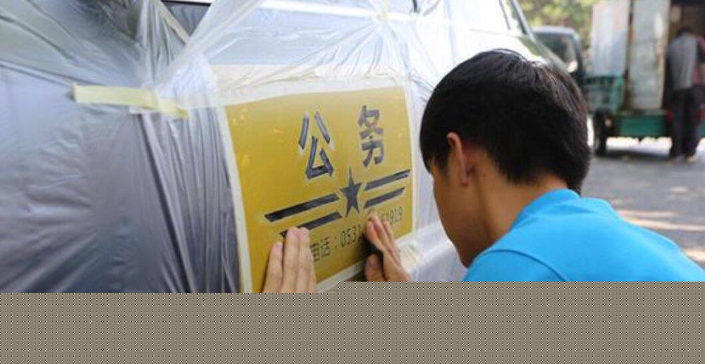 工作人員先把一張有“公務(wù)用車”標(biāo)識以及“監(jiān)督電話”字樣的專用標(biāo)識紙,通過轉(zhuǎn)印紙貼在公車的前門中間上,并用磨砂紙按照字印在門上進行打磨,對兩側(cè)的車體覆蓋上薄膜進行保護后,工作人員開始對車體噴漆,每隔5分鐘噴涂一次,連續(xù)噴涂三次以后,工人們才將轉(zhuǎn)印紙揭下,一輛公車的標(biāo)識噴涂就完成了。深色車輛噴涂標(biāo)識顏色為白銀色,淺色車輛噴涂標(biāo)識顏色為警藍色。