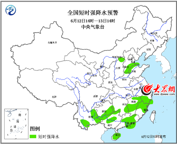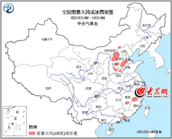 預(yù)計(jì)6月12日14時(shí)至13日14時(shí),山西北部和東南部、河北東南部、山東西北部、河南北部、福建北部、江西中部等地局部有雷暴大風(fēng)或冰雹天氣;河北東南部、山東西北部、浙江中南部、江西中北部、湖南南部、貴州東南部、云南東部和南部、廣西中部和北部、廣東、海南等地的部分地區(qū)將有短時(shí)強(qiáng)降水天氣,小時(shí)雨強(qiáng)30-50毫米,局地可達(dá)60毫米以上。其中,華北地區(qū)的強(qiáng)對(duì)流天氣最強(qiáng)時(shí)段在12日午后至前半夜。