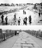 上圖:日軍占領(lǐng)下的盧溝橋(資料照片);下圖:2015年6月28日,游客從盧溝橋上走過(guò)。