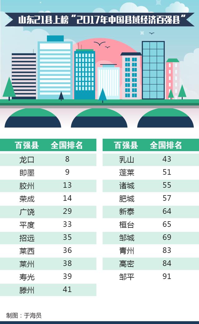 近日,“2017中國百強縣創(chuàng)新發(fā)展論壇”在北京舉行。在論壇上,工信部所屬的賽迪顧問發(fā)布了《2017年中國縣域經(jīng)濟百強白皮書》,從經(jīng)濟實力、增長潛力、富裕程度、綠色發(fā)展等4個方面篩選了12項指標,對2016年縣域經(jīng)濟體的發(fā)展情況進行了分析和考察。山東龍口、即墨、膠州、榮成、廣饒、平度、招遠、萊西、萊州、壽光、滕州、乳山、蓬萊、諸城、肥城、新泰、桓臺、鄒城、青州、高密、鄒平等21縣市上榜全國縣域百強,其中排名最靠前的龍口市位列第8。