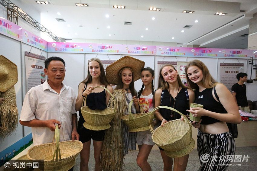7月27日,日照,來自2017年中國(日照)國際啦啦操精英賽的外國友人在日照市會展中心參觀了日照市非物質文化,并與日照剪紙、農民畫、黑陶和線獅表演等項目的非遺傳承人現場互動,了解了日照市非遺項目的歷史淵源、特色風格、工藝流程以及當代保護傳承的情況,直觀地感受了日照優秀的非物質文化遺產的魅力。