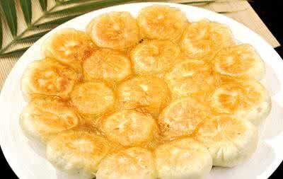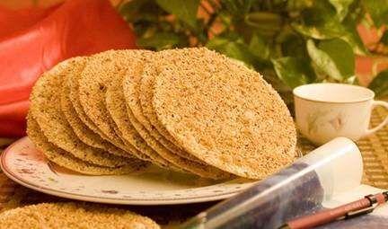 外形圓而色黃,正面貼滿芝麻仁,背面酥孔羅列,薄似楊葉,拿起一疊,有唰唰之響聲,如風中之白楊。吃起來,入口一嚼即碎,香滿口腹,酥脆異常,且久嚼不膩,若失手落地,則會皆成碎片。周村燒餅源于漢代的胡餅,明朝中葉,飲食店師傅們根據焦餅薄香脆的特點,用上貼烘烤胡餅的方法,創造出了大酥燒餅。1979年,大酥燒餅以“周村”作為商標進行注冊,正式定名為“周村牌”周村燒餅。