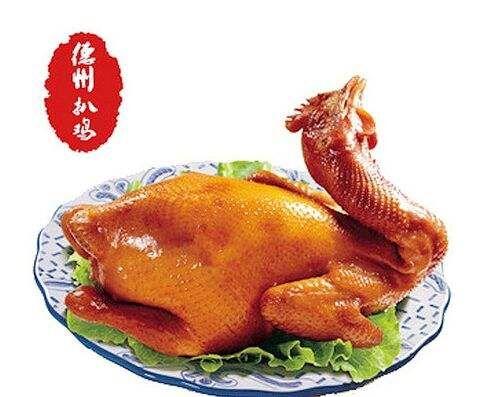 形色兼優、五香脫骨、肉嫩味純、清淡高雅、味透骨髓、鮮奇滋補。造型上兩腿盤起,爪入雞膛,雙翅經脖頸由嘴中交差而出,全雞呈臥體,色澤金黃,黃中透紅,遠遠望去似鴨浮水,口銜羽翎,十分美觀,是上等的美食藝術珍品。德州扒雞起源于元末明初,相傳在清朝出現了扒雞的原始做法,即大火煮,小火燜,即火候先武后文,武文有序,扒雞名中的“扒”也來源于此。