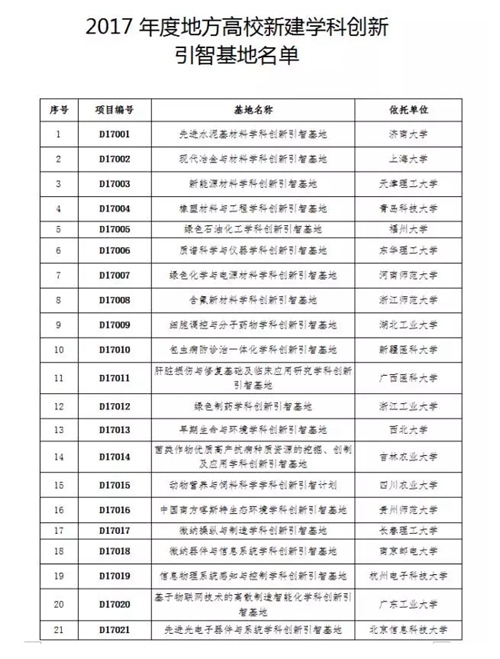 近日,教育部發(fā)布了《國家外國專家局 教育部關(guān)于2017年度地方高校新建學(xué)科創(chuàng)新引智基地立項的通知》(點擊文末左下角“閱讀原文”查看),國家外專局和教育部正式公布了2017年度地方高校“高等學(xué)校學(xué)科創(chuàng)新引智計劃”(即“111計劃”)立項名單,全國共有21所地方強校獲批,山東省兩所省屬高校濟南大學(xué)和青島科技大學(xué)入選。