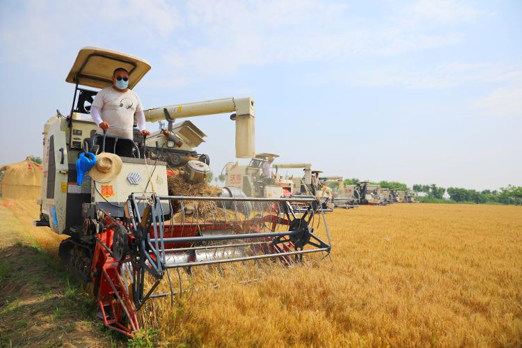 6月11日上午,濱州市濱城區三河湖鎮,濱州中裕食品有限公司優質小麥訂單基地,金黃麥浪隨風翻涌。“齊魯糧油”夏收季暨中裕200萬畝優質小麥種植基地開鐮儀式在此舉行。