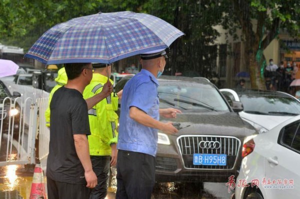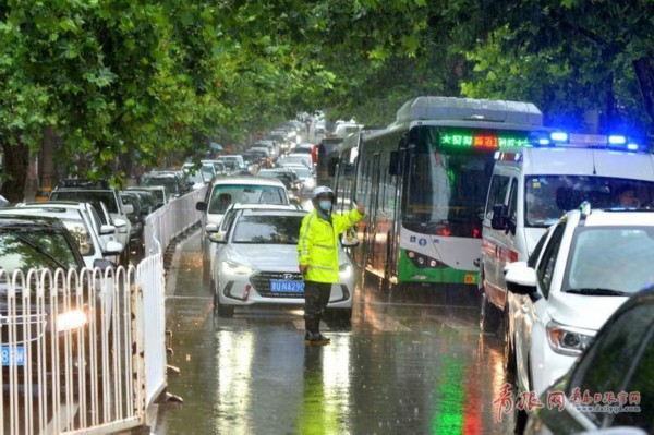 上午10時許,受降雨和就醫車輛的增多,江蘇路青島大學附屬醫院門前成為堵點,市南交警大隊中山路中隊增派警力疏導交通。記者在江蘇路和龍口路交叉口看到,共有7名交警冒雨值勤。市南交警大隊中山路中隊中隊長劉清泉剛從大隊開完會,身著執勤服,來不及回中隊拿雨衣便出現在馬路上指揮交通。雨水很快將劉清泉打濕,不少群眾見此景主動為劉清泉打傘。