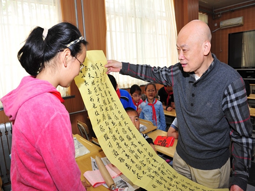 5月21日上午,青島市嘉峪關小學的20多名小書法愛好者迎來了在青島市康有為故居紀念館舉辦“范斌書法藝術天游園特展”(展期5月18日—5月24日)的著名書法家范斌先生。